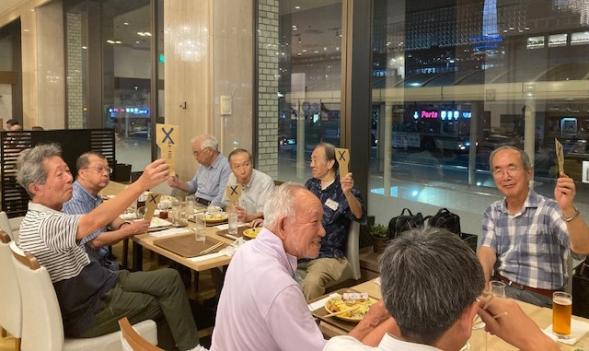 参加者全員の挨拶や近況報告などのあと、〇×クイズで楽しみました。質問がやさしすぎたせいか正解者多数が続きましたが、半数近い方に豪華景品(?)が送られました。最後に記念撮影をして散会しました。
