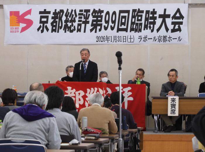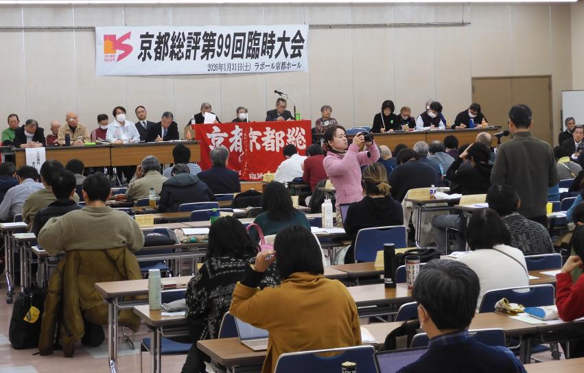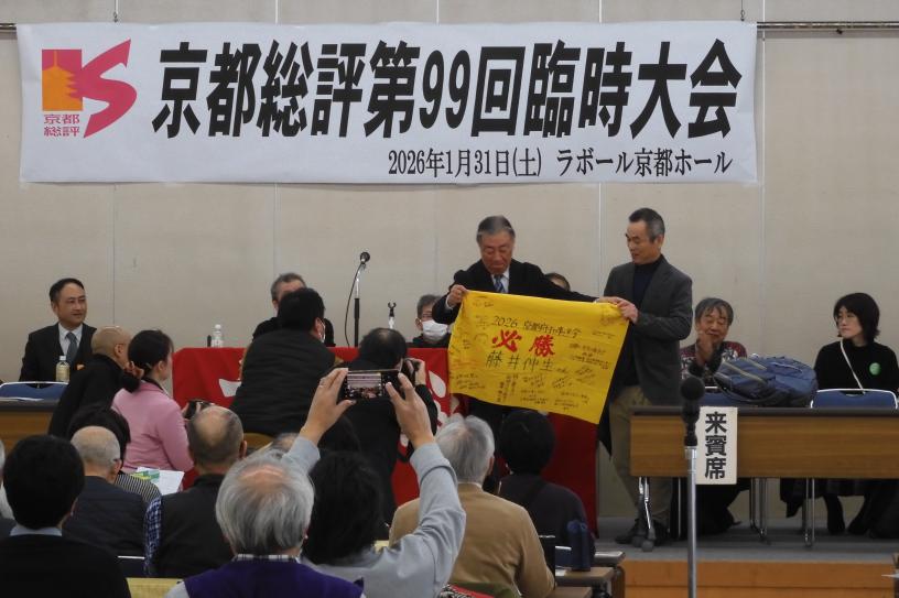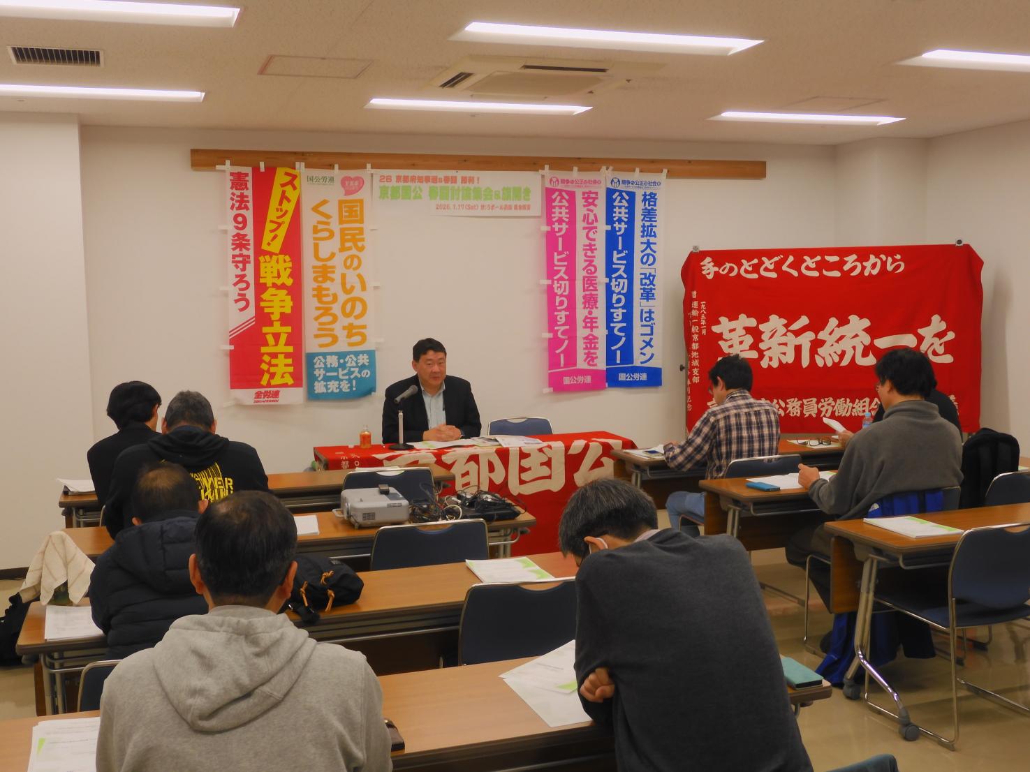 1月17日(土)10時からラボール京都にて、「26春闘・知事選勝利をめざす京都国公春闘討論集会」と、引き続いての旗開きを開催しました。集会では、厳しい職場状況が報告され、諸要求実現に向けて奮闘することを確認しました。