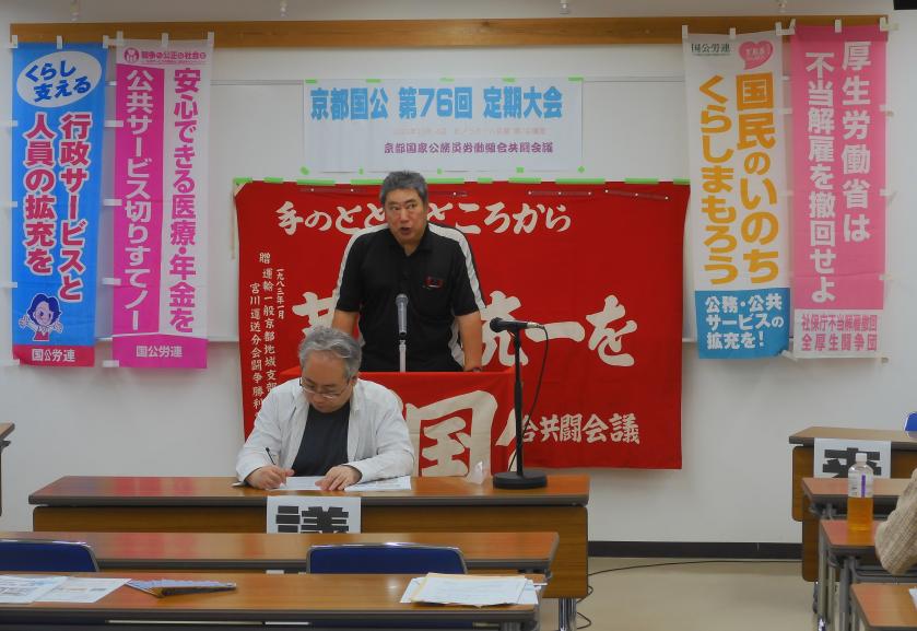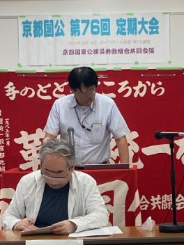 京都国公新庄議長の開会あいさつに続いて、来賓あいさつをした京都総評梶川議長から「コロナ禍で公共の役割が注目されており、労働組合への期待が高まっている」との激励がありました。方針提案の後、討論が行われ、全単組から職場状況等の報告や平和と民主主義を守る取り組みなどの発言がありました。提案されたすべての議案はすべて承認され、新役員も承認されました。最後に大会宣言を確認して大会は終了しました。引き続き、国民本位の行財政・司法、医療・教育の確立に向けて、頑張っていきます。
